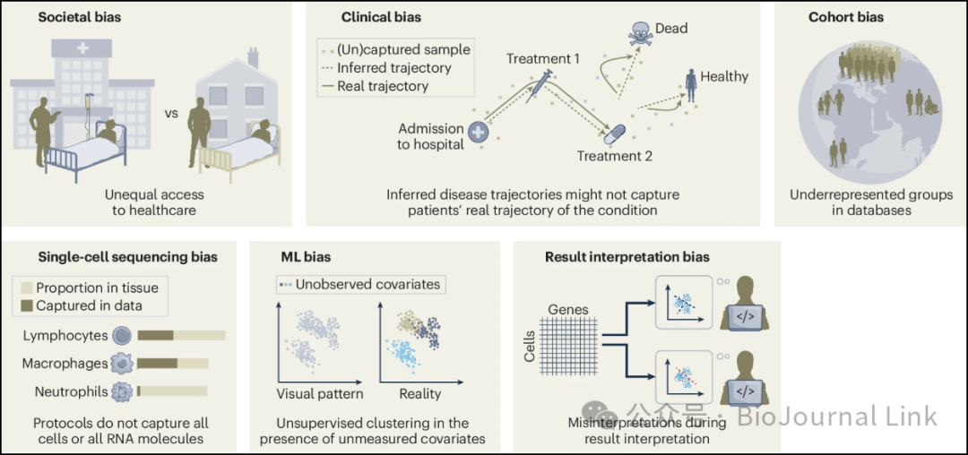 ◉ 社会偏见源于医疗系统中的结构性不平等。◉ 临床偏见源于临床数据收集和处理中的一致性问题,这引入了变异性。◉ 队列偏见源于队列构成的偏差,包括人口统计学和临床多样性。◉ 单细胞测序偏见源于技术限制和测序方法的变异性,影响数据质量。◉ 机器学习偏见源于算法和模型参数的选择,这可能产生或放大偏见。◉ 最后,结果解释偏见源于灵活的可视化和解释工具,这些工具持续或强化偏见结论,影响下游的科学和临床见解。