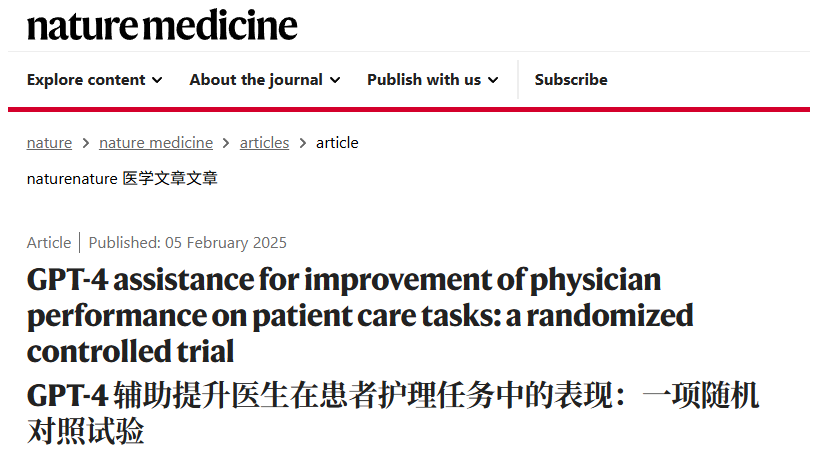 近期,Nature Medicine 刊登了一篇关于GPT-4在临床应用的文章《GPT-4 assistance for improvement of physician performance on patient care tasks: a randomized controlled trial》,这篇文章展示了GPT-4在医学科研中的巨大潜力,能够辅助医生提高复杂临床管理的推理水平。