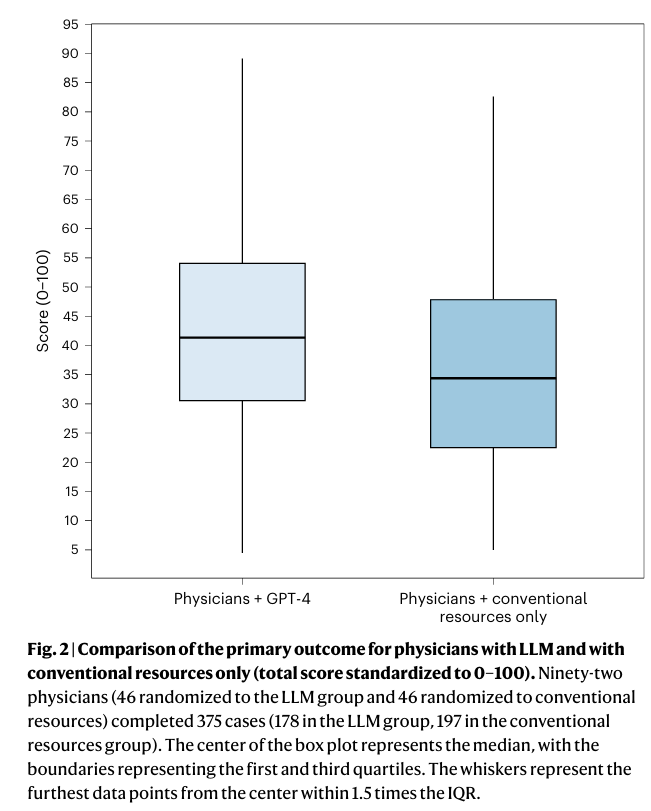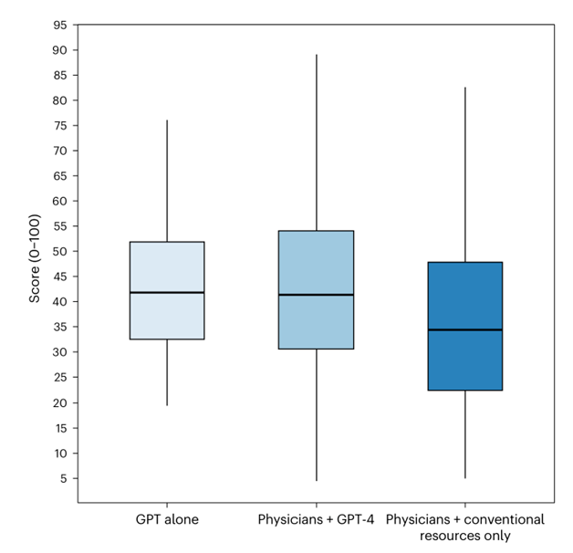 研究团队通过一项随机对照试验,评估了GPT-4在医生管理推理任务中的应用效果。92名执业医生被随机分为两组,一组使用GPT-4与传统资源,另一组仅使用传统资源,两组同时对5个基于真实病例的临床案例进行分析。