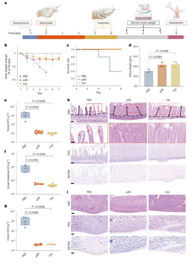 接着,作者在由伤寒沙门氏菌引起的急性肠道感染小鼠模型中进行了p45治疗效果体内评估。接受p45治疗的小鼠能够防止体重下降,且存活率高,小鼠粪便、小肠和结肠中沙门氏菌的含量减少。不同治疗的感染小鼠的小肠和结肠组织切片显示p45处理组和环丙沙星处理组的小肠绒毛上杯状细胞的数量明显高于PBS组,且结肠肌层增厚、结构紊乱和炎症的情况有所改善。以上结果都表明了p45的治疗效果与环丙沙星相当。(图5)