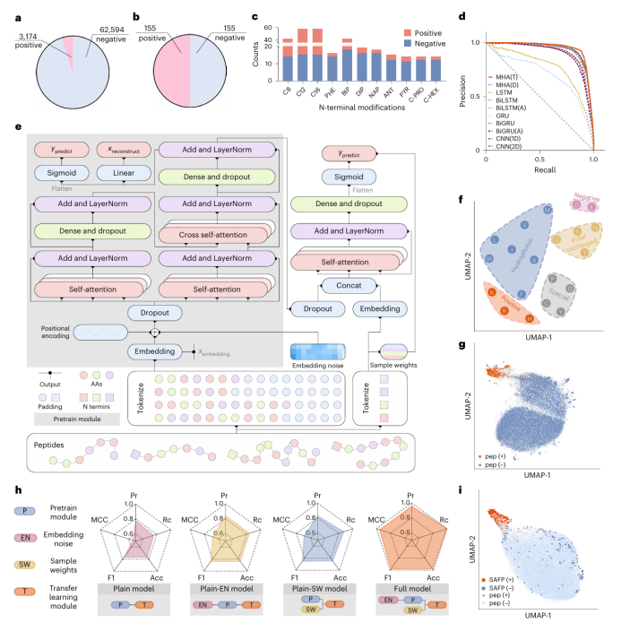 首先, 作者从抗菌活性和肽结构数据库(DBAASP)中汇编了基于20种天然氨基酸的肽的抗菌活性数据集。同时合成在N端具有自组装基团的肽,并测试其抗菌活性,创建了一个包含正负训练样本平衡的SAFP抗菌活性数据集。作者经过十种经典序列学习模型架构的基准测试,最终搭建了一个预训练-迁移学习自注意力神经网络模型架构用于开发SAFP。迁移学习模块的输入是预训练模块的潜在输出与N端自组装基团的拼接,同时作者进行了噪声增强和样本权重平衡,最终完整的模型在所有性能指标上较好。(图2)