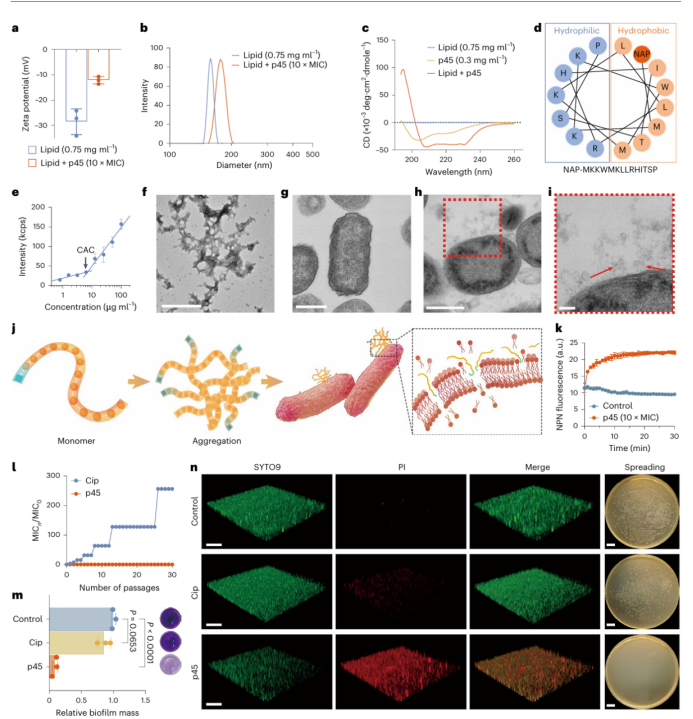 最后,作者研究了p45的抗菌机制,在膜和细胞水平进行了实验。作者构建了脂质双层模型,与10倍MIC浓度下的p45相互作用后脂质膜电位和直径增加,二级结构呈现以螺旋为主的更具两亲性的结构,表明p45与膜结合。透射电子显微镜表明,p45自组装形成了纳米纤维聚集体,与伤寒沙门氏菌作用后与细菌膜结合,导致膜通透性下降并破坏细菌膜的完整性。此外,经过多次传代后伤寒沙门氏菌对环丙沙星的抗药性明显强于p45。生物膜清除实验也表明p45相比于环丙沙星具有明显的优势。(图6)