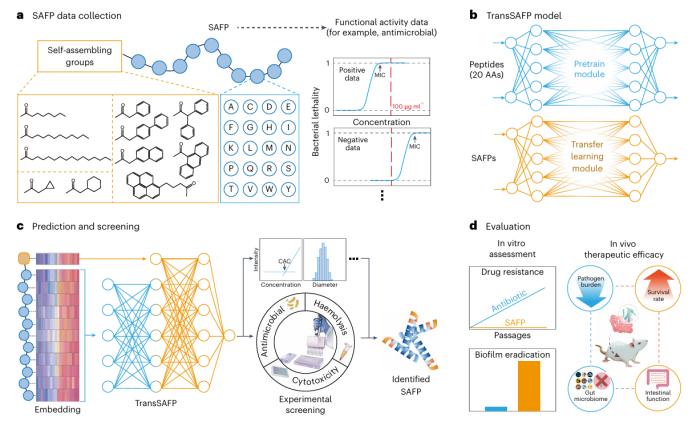 本文开发了一种基于深度学习的迁移学习模型——TransSAFP,该模型仅依靠少量实验工作对样本进行注释,就能有效地预测自组装功能多肽(SAFP)的功能活性。作者利用 TransSAFP 从头设计了具有抗菌活性的新型 SAFP,以应对当前的细菌耐药性问题。
