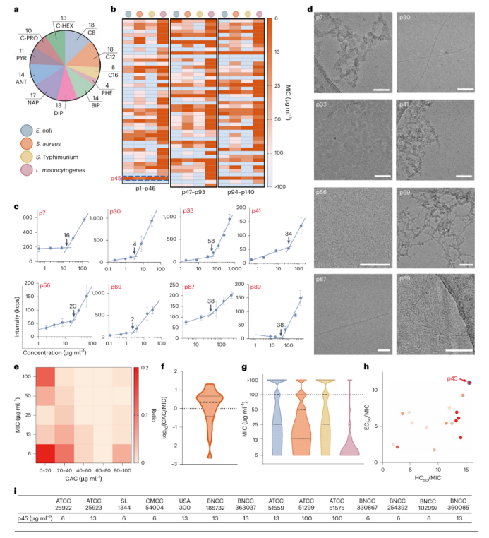 随后,作者使用此TransSAFP模型进行后续的抗菌SAFP筛选工作。作者用公共数据集中的肽序列和11种自组装基团,生成了一个新的SAFP序列空间,并使用TransSAFP进行预测,最终选定140个候选肽(p1-p140)进行合成与纯化,然后测试了这些候选肽对四种细菌株的MIC。低温电子显微镜(cryo-EM)图像表明SAFPs在自组装后呈现多种不同的组装形态,包括纳米聚集体、长纤维、蠕虫状结构、纳米网、短纤维等。同时作者发现SAFPs的抗菌活性通常与它们的自组装能力正相关。作者选择了抗菌效果最好的SAFP p45,以及伤寒沙门氏菌进行后续的筛选实验。(图3)