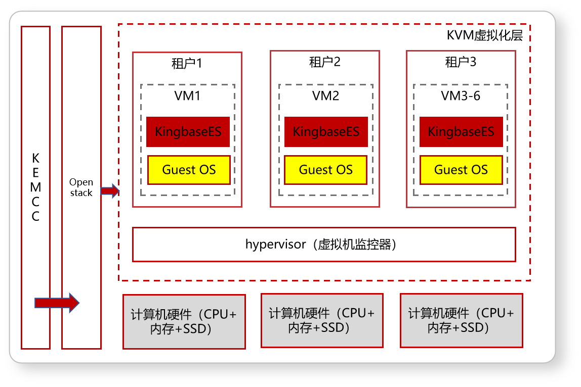 金仓数据库的虚拟化平台方案依托 KVM 虚拟化技术,为每个租户精心分配独立的 VM资源,各VM资源相互隔离,又共享主机资源。通过Openstack对虚拟化层进行统一管理,包括动态调整租户规格、资源的动态扩缩容管理等。能够灵活应对租户业务的变化。