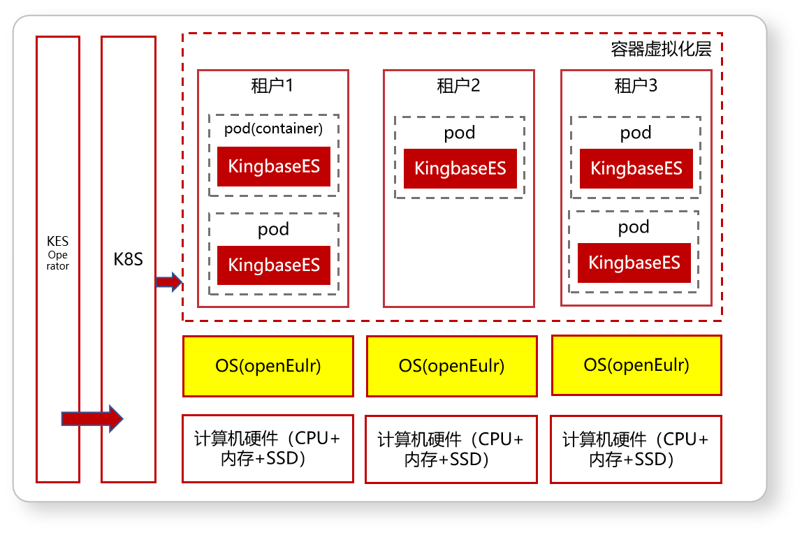基于 Kubernetes 与 Docker 容器技术,构建了一个高效、灵活的多租户方案。Operator 作为 Kubernetes 的一种扩展机制,在金仓数据库的容器化平台方案中发挥着重要作用,实现了数据库实例的快速部署与高可用。