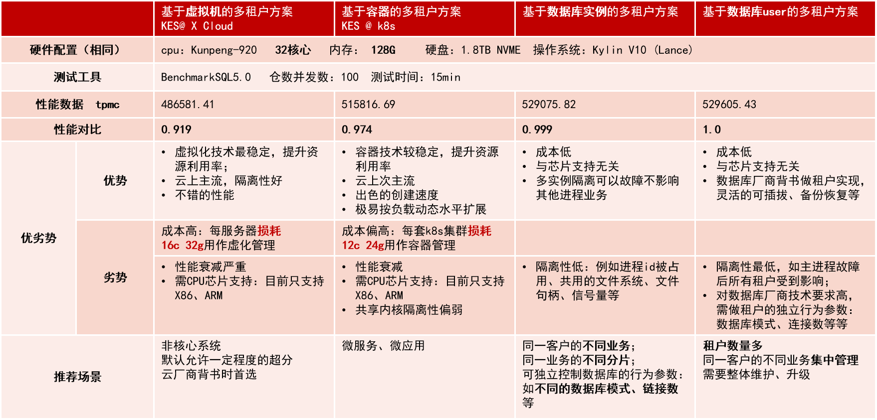 上表为金仓提供的多租户方案性能对比分析和选项建议,可以看出:
