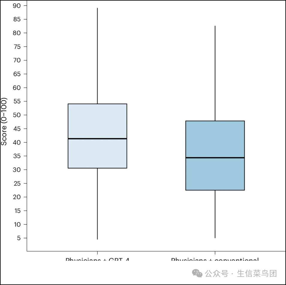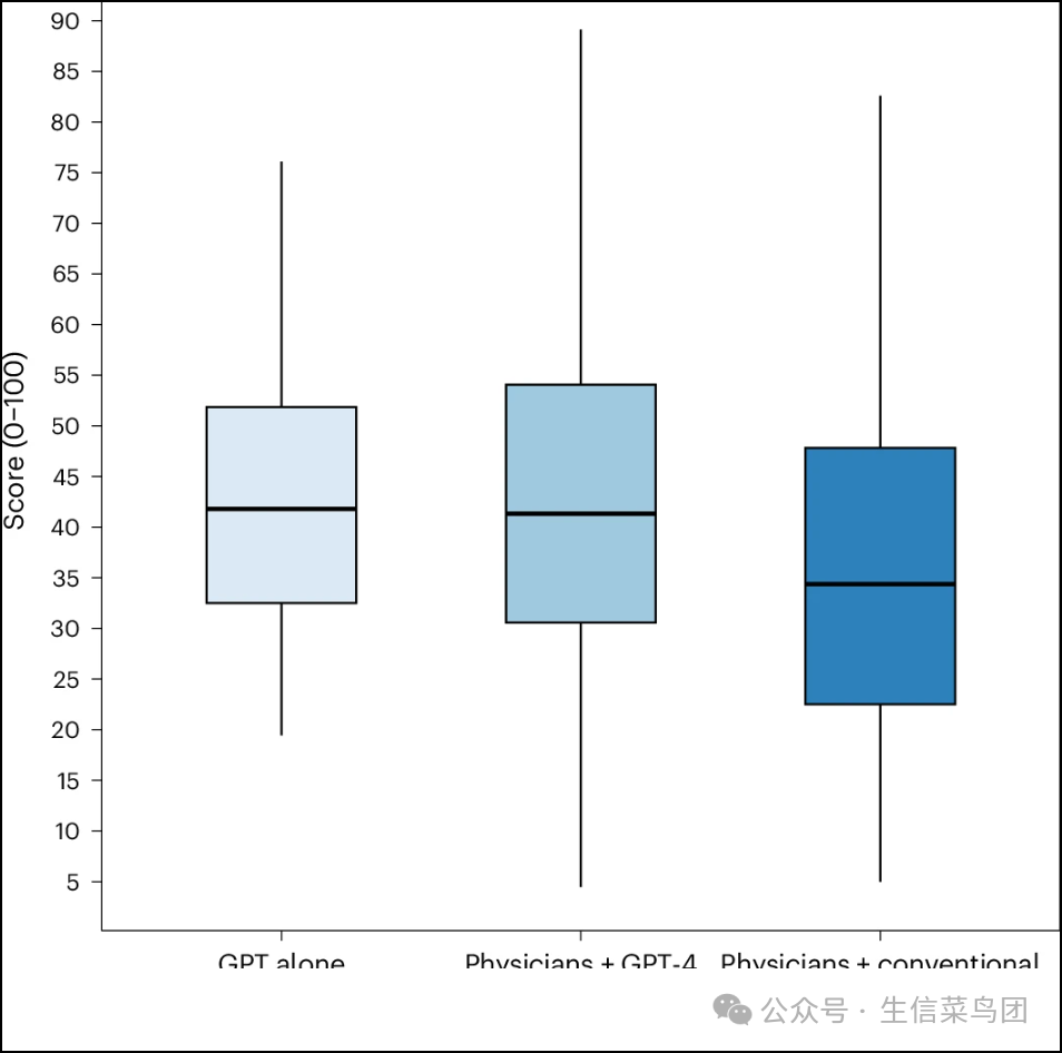 ◉ GPT-alone 组代表由研究团队提示模型完成五个案例,每个案例提示模型五次,总共得到25个观察结果。◉ 拥有 GPT-4 的医师组包括46名参与者,完成了178个案例,而拥有传统资源的医师组包括46名参与者,完成了197个案例。◉ 箱线图的中心表示中位数,边界表示第一和第三四分位数。◉ 须触线表示中心点外最远的数据点,在1.5倍四分位距(IQR)范围内。