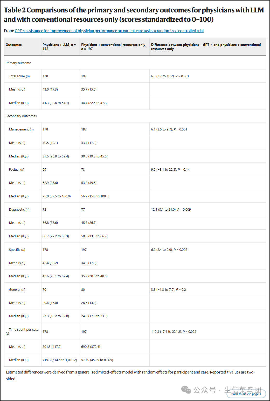 Table 2 Comparisons of the primary and secondary outcomes for physicians with LLM and with conventional resources only (scores standardized to 0–100) 表2 医师使用LLM和仅使用传统资源的主要和次要结果比较(分数标准化为0-100)
