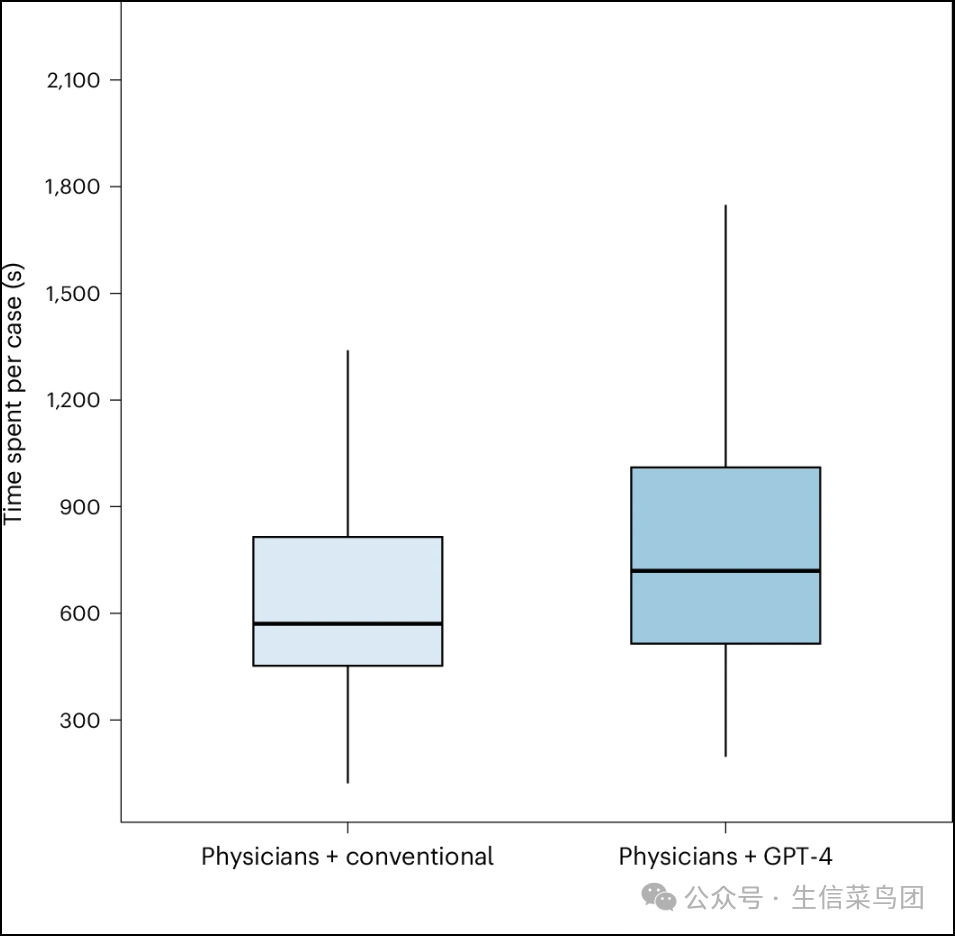 Fig. 4: Comparison of the time spent per case by physicians using GPT-4 and physicians using conventional resources only.