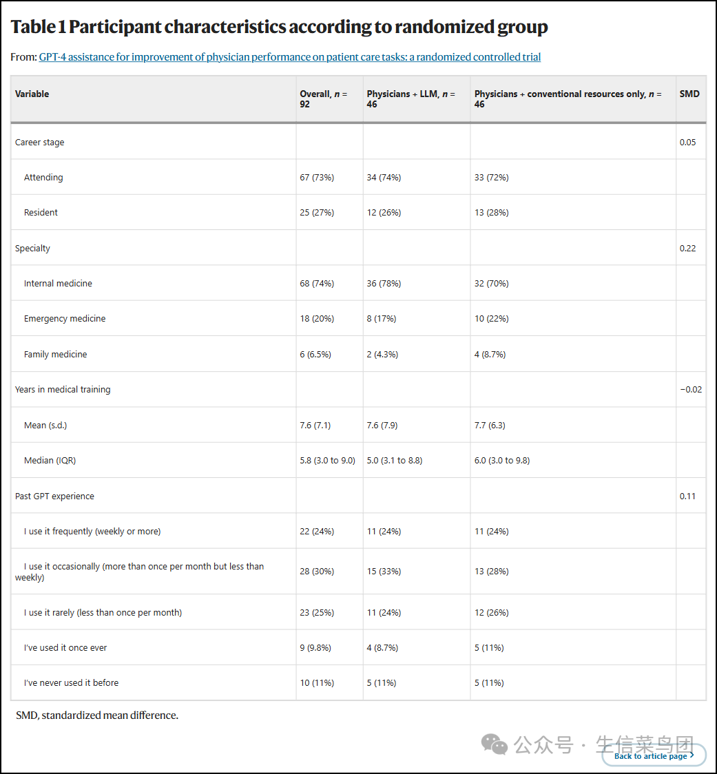 ◉ 这项研究包括92名正在执业的主治医师和住院医师,他们接受过内科、家庭医学或急诊医学的培训。◉ 提出了五个由专家开发的病例,并使用德尔菲法创建了评分标准。◉ 医生们被随机分配到两个组,一组使用GPT-4通过ChatGPT加上传统资源(例如,UpToDate、Google),另一组仅使用传统资源。◉ 主要结果是在专家开发的评分标准上两组总分的差异。◉ 次要结果包括特定领域的分数和每个病例所花费的时间。◉ 数据来源
