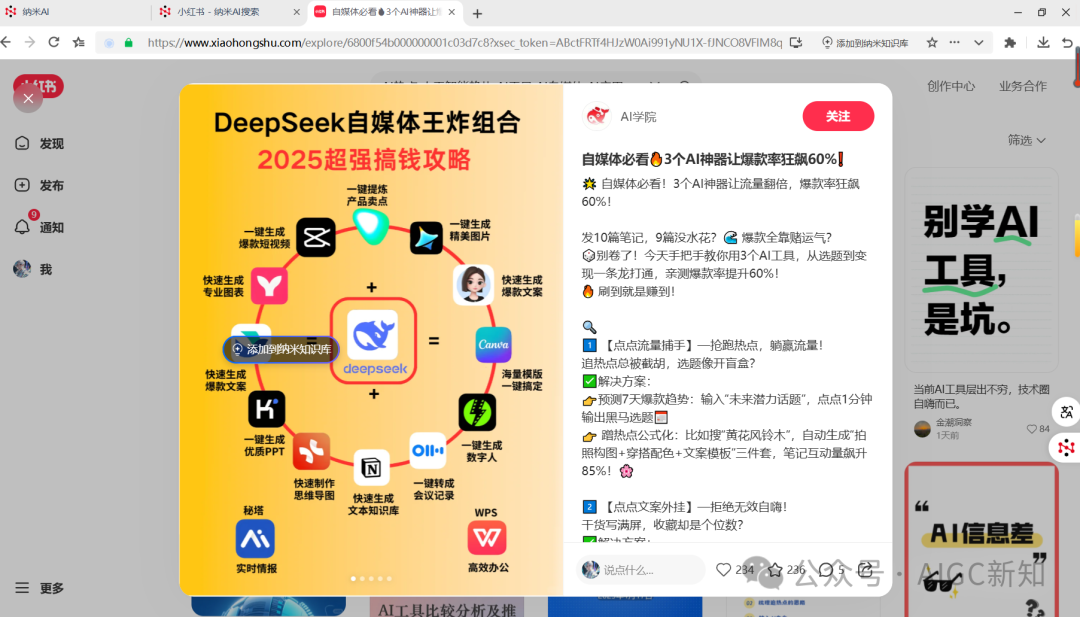 它打开的是纳米AI浏览器自带的浏览器,所以你就可以在另外一个窗口看到它在吭哧吭哧的浏览网页,然后打开小红书笔记,读完内容之后,然后添加到纳米知识库