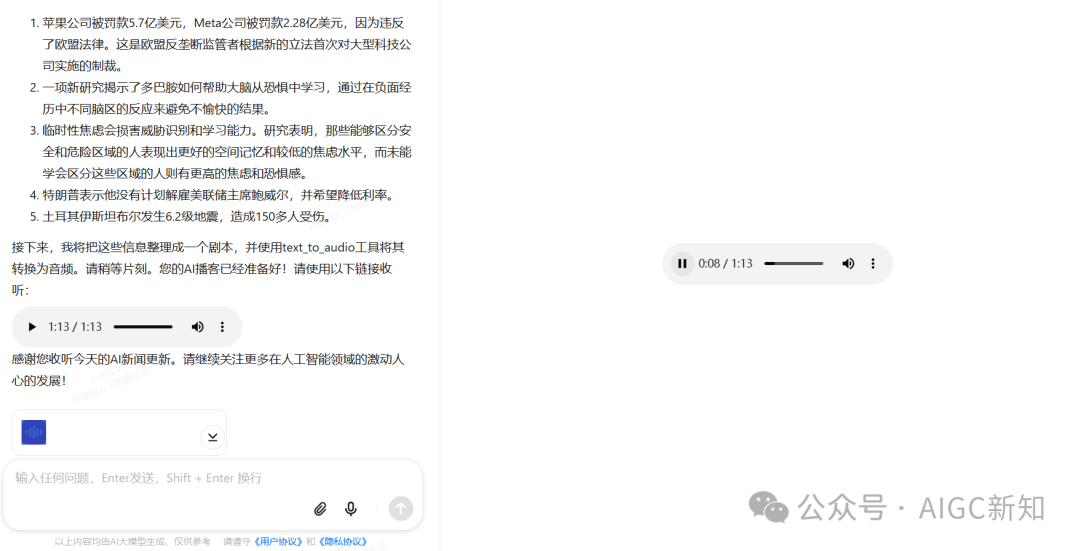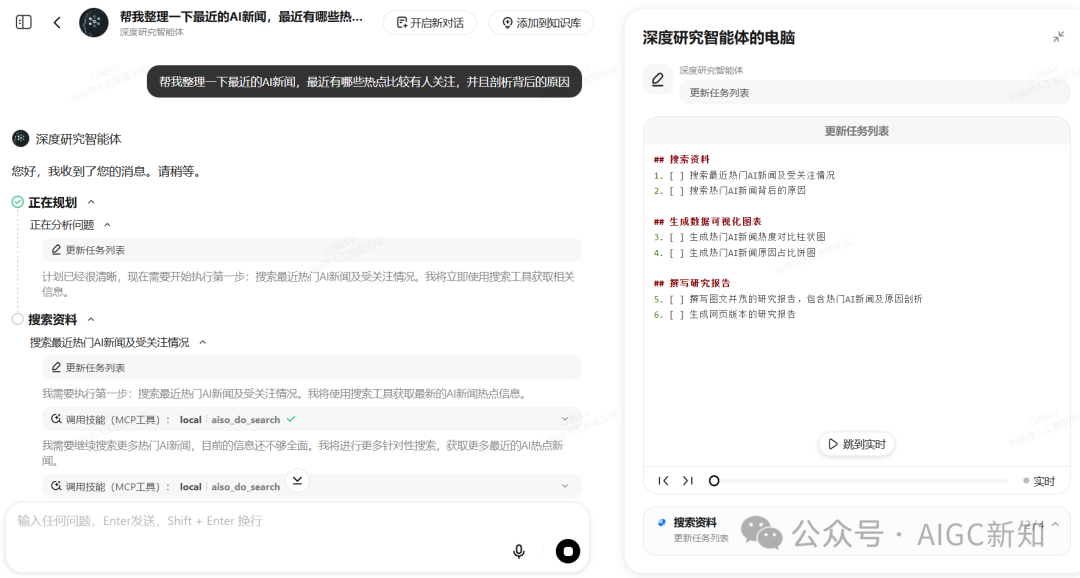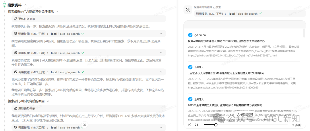 接下来进行搜索最新的AI新闻,其实你在右边就可以看到,他是调用了一个本地浏览器的MCP工具:aiso_do_search,专门用于搜索网络信息的,这样间接保证了信息安全。