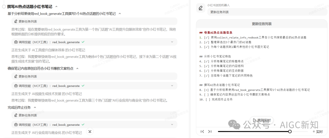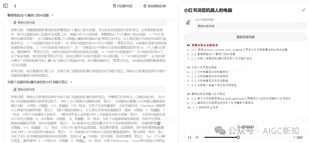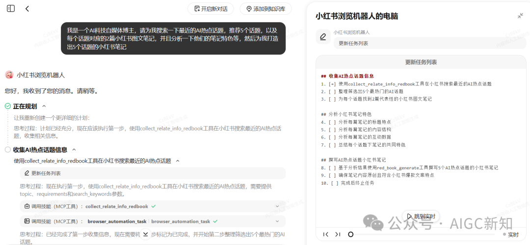 然后他就会去自动调用MCP工具去网页浏览小红书,使用collect_relate_info_redbook工具在小红书搜索最近的AI热点话题。
