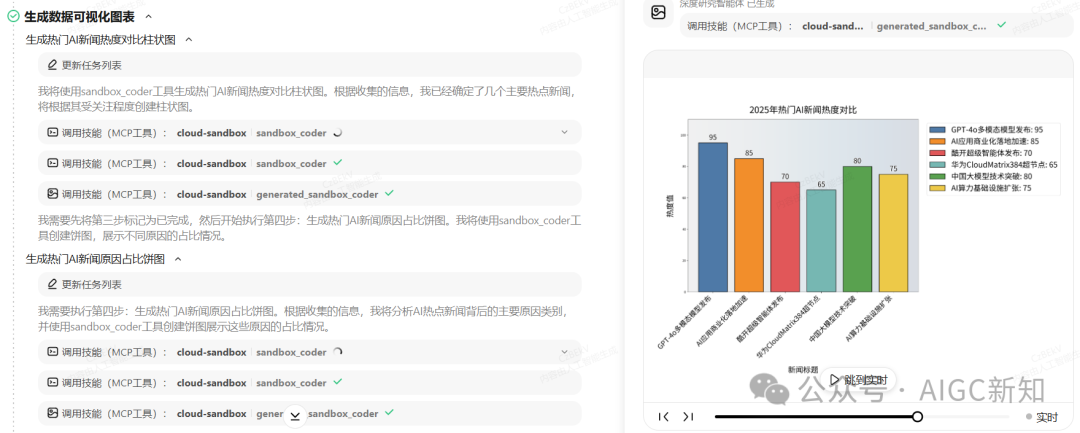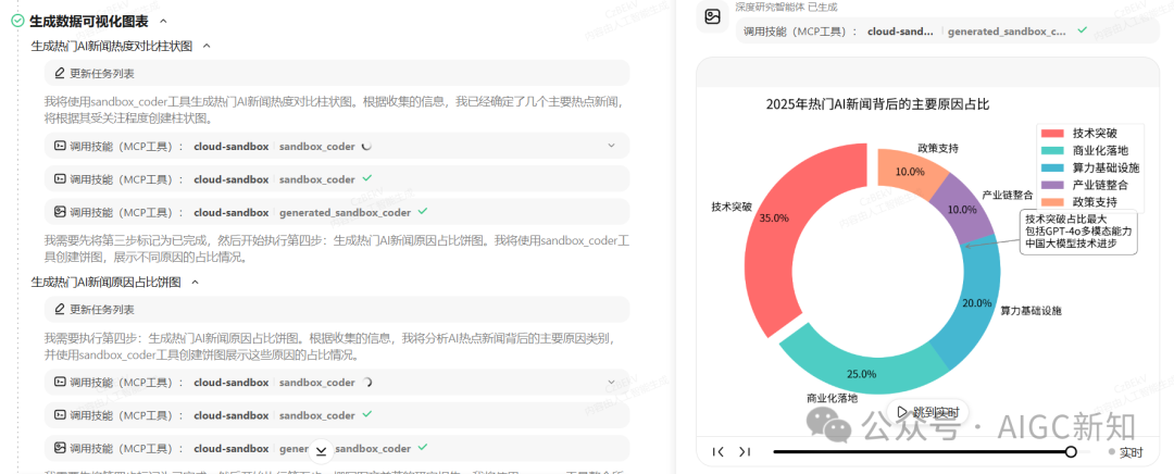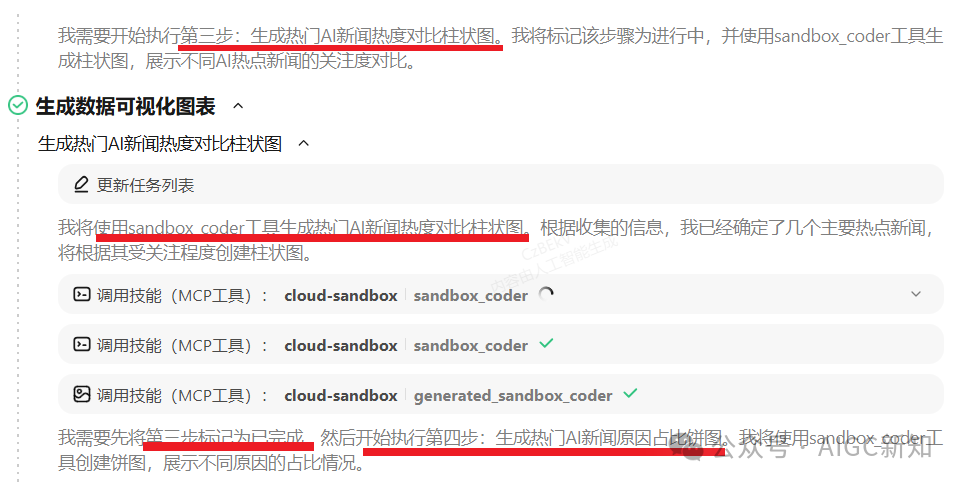 信息搜集好之后,接下来就开始生成可视化图表了,在执行细节上可以看到,基于第一步的任务列表更新进行推进,然后每一步执行完,会引导开启下一步的任务开始执行。