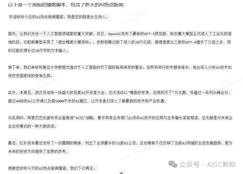 根据检索的AI热点新闻,它为我撰写的AI播客脚本。