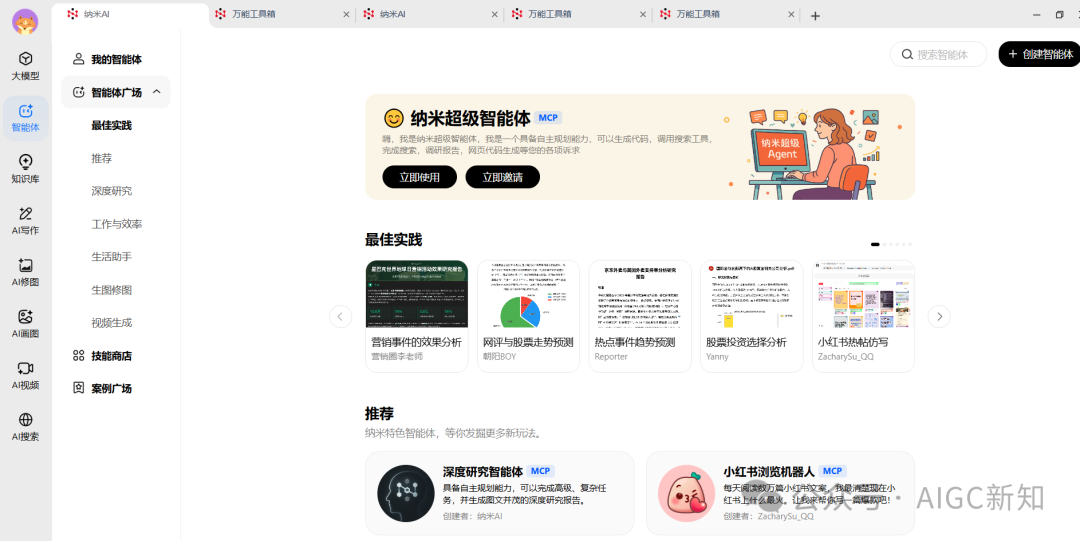 首先在左侧栏点开智能体,进入智能体广场,然后就可以看到目前位于首页的纳米超级智能体,左侧也可以看到技能商店以及案例广场。