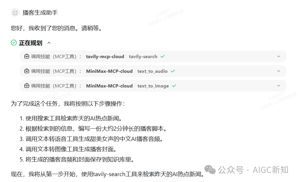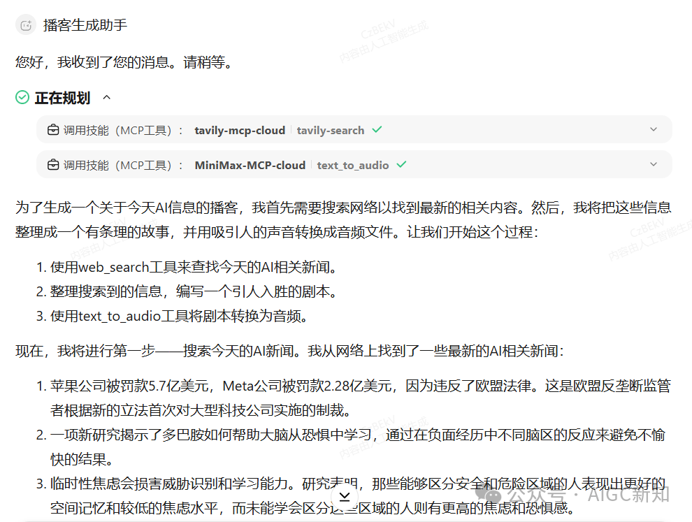 再比如说,我让他去帮我生成一个当天的AI播客,它也犯傻,如果让我们自己来做的话,首先得搜集信息,然后提取信息,整理为对话脚本,然后我们自己录制或者让工具进行文本转语音,