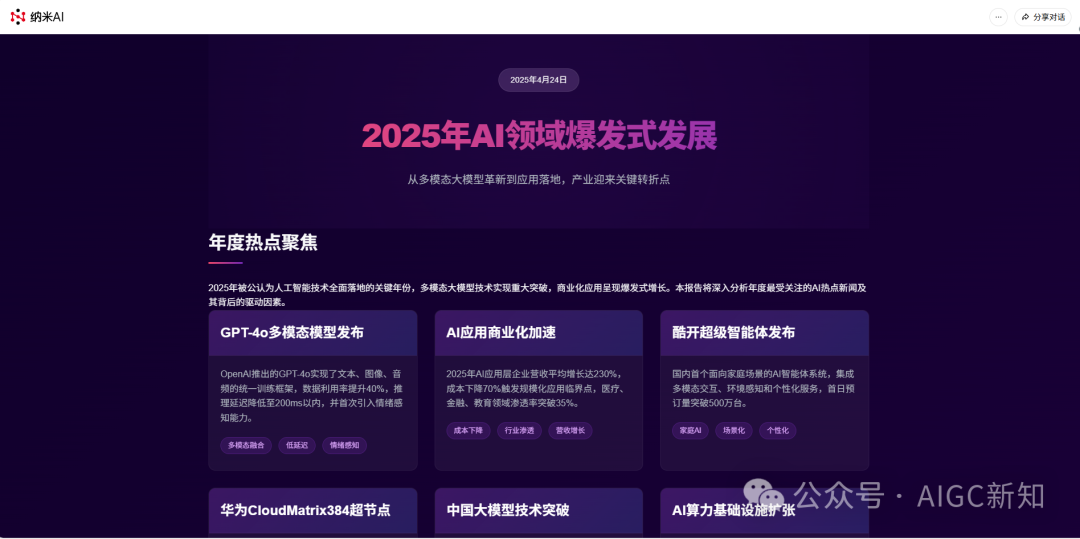 网页可以在这里看到:https://mw8sua.n.cn/,更加惊艳的是,生成的网页主题、内容恰到好处,包括配色、标签以及图表的分布,都是很美观的。