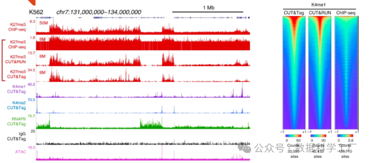 通过计算峰区中的片段比例(FRiPs)来衡量信噪比,并将其与 IgG 对照数据集中的 FRiPs 进行对比,以便更直观地展示结果。尽管 CUT&Tag 实验的测序深度通常只有 100-500 万片段,但由于该方法的背景噪声较低,因此 FRiP 分数往往较高。