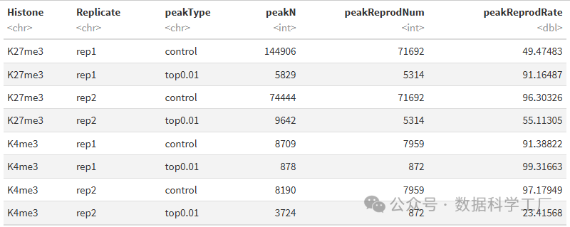 peakReprod %>% select(Histone, Replicate, peakType, peakN, peakReprodNum = peakReprod, peakReprodRate)