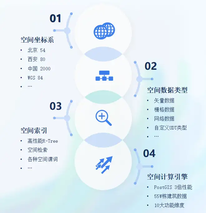 YashanDB 针对 GIS 场景专门做了数据库层的空间增强,涵盖引擎、中间件、索引和计算能力,具体如下: