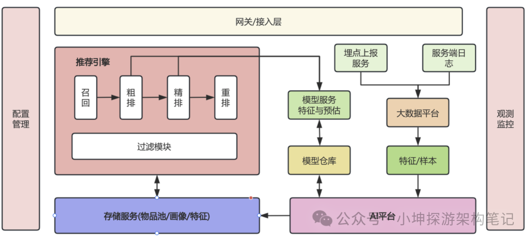 另外,我们从用户请求链路上看,基于上述的业务流程转换为系统层面的逻辑, 这个时候要求我们关注系统每个层面的职责,结合上述的模块分布, 我们将推荐系统进行分层设计如下: