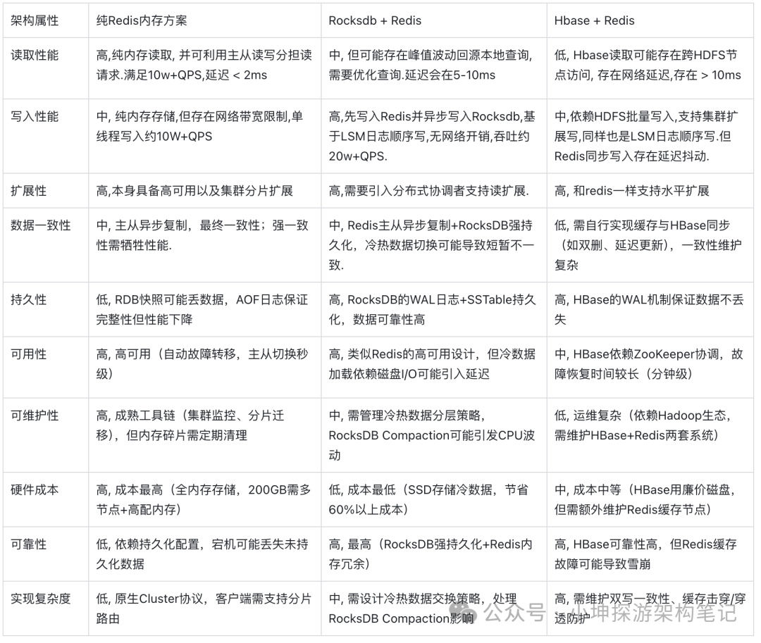 通过上述设计的备选方案不同, 对应的架构设计属性也不同, 因此还是回归目标, 画像系统服务对架构属性的要求是怎样的, 对于画像系统数据一旦用户画像数据丢失, 直接影响到后续的特征以及模型预估, 导致出现质量偏低的推荐列表, 极大影响用户体验, 这与我们要提供的价值主张产生矛盾.因此可靠性以及可用性是我们首先要考虑的一点, 因而从上述备选架构方案中, 我们会选择Redis + Rocksdb 或者是Hbase + Redis的方式, 接下来要考虑满足低延迟的高性能要求, 这个时候我们会选择Redis + Rocksdb和Redis内存的架构设计方式, 同时满足上述可靠性+可用性+低延迟高性能要求, 我们将采用Rocksdb + Redis的架构技术方案. 最后我总结一点就是对架构属性进行排序选择合适的技术方案.