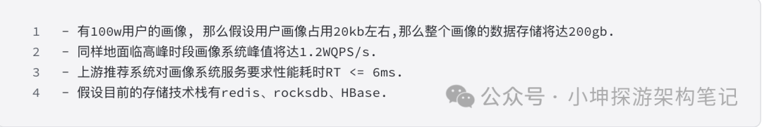 在此进行PSM建模之前,我们先考虑以下业务背景, 即我们要搭建一个支持百万用户在线的直播推荐系统,其中高峰时段在每天晚上8点-8点05分会存在大量用户涌进平台看直播.同时这里我们仅考虑如何构建技术备选方案来实现推荐系统中的用户画像系统服务.