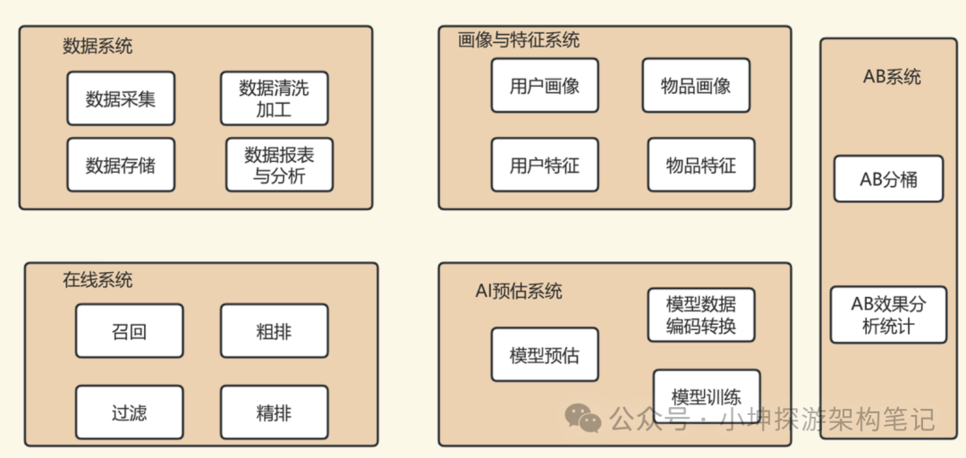 通过上述的业务流程分析, 我们一个完整的推荐系统至少需要以下部分: