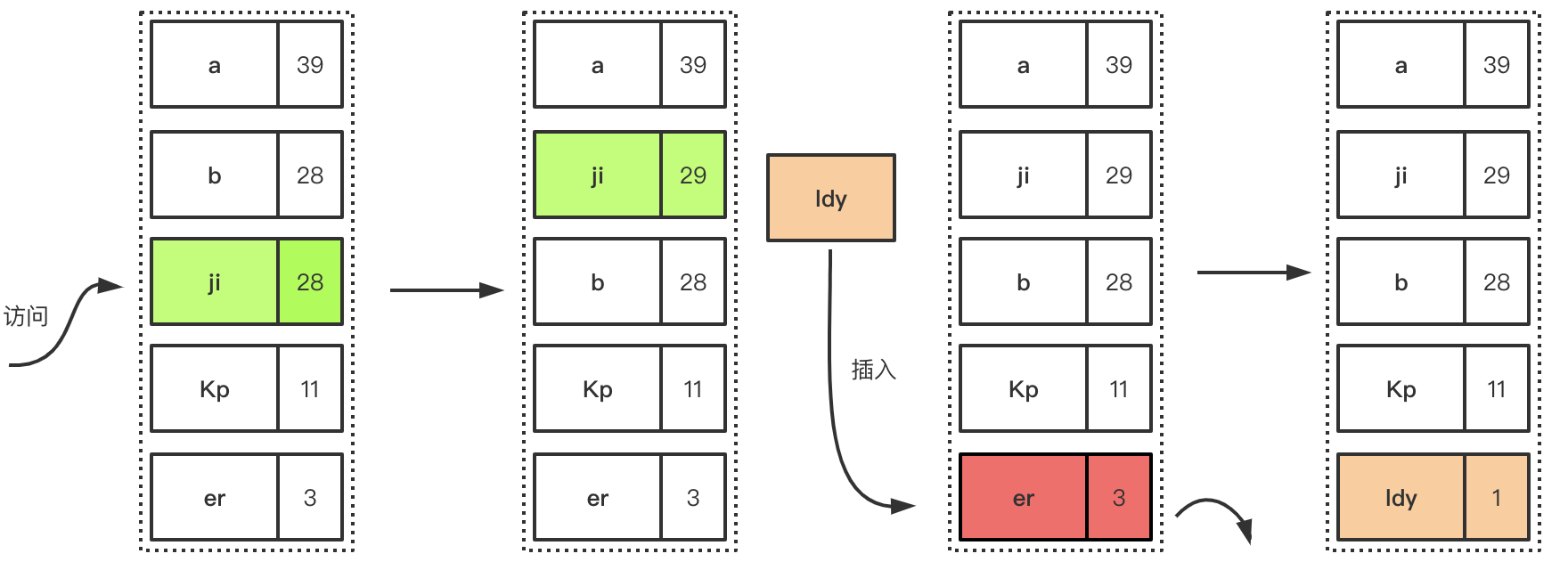 最近最久未使用: 如果一个数据最近很少被访问到,那么被认为在未来被访问的概率也是最低的,当规定空间用尽且需要放入新数据的时候,会优先淘汰最久未被访问的数据