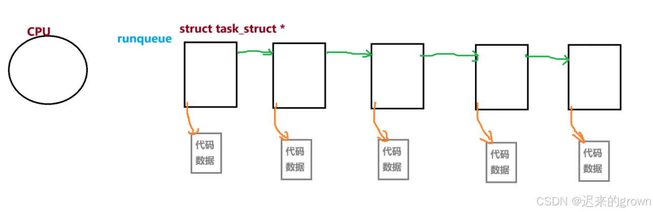 task_struct管理起来,存在一个全局队列,每一个进程的task_struct都在这一个全局队列中; 但是我们在上述中提到了,进程运行态就是进程的task_struct处于CPU的运行队列中,而阻塞态就是进程的task_struct处于硬件资源中的等待队列中; 那我们的task_struct是如何实现既在全局队列中,又在运行队列/等待队列中呢?