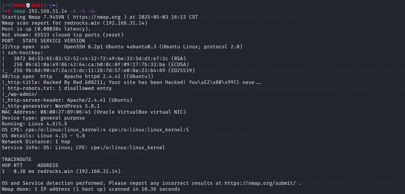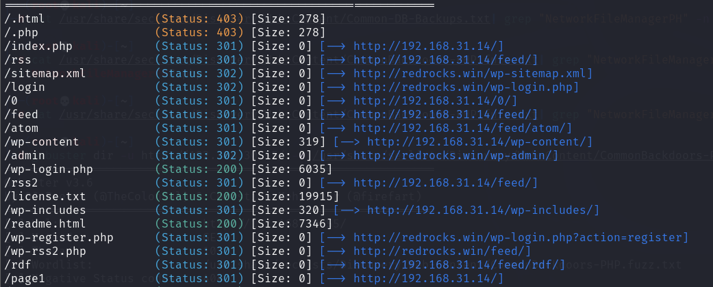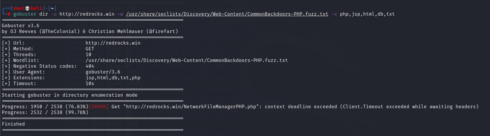 gobuster dir -u http://redrocks.win -w /usr/share/seclists/Discovery/Web-Content/CommonBackdoors-PHP.fuzz.txt -x php,jsp,html,db,txt