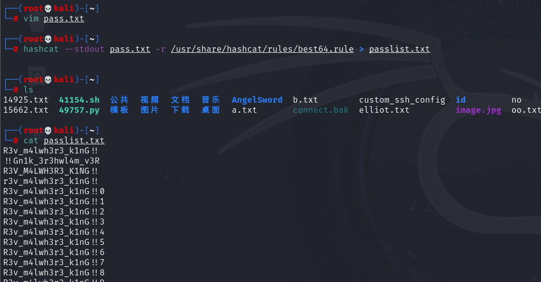 hashcat --stdout pass.txt -r /usr/share/hashcat/rules/best64.rule > passlist.txt