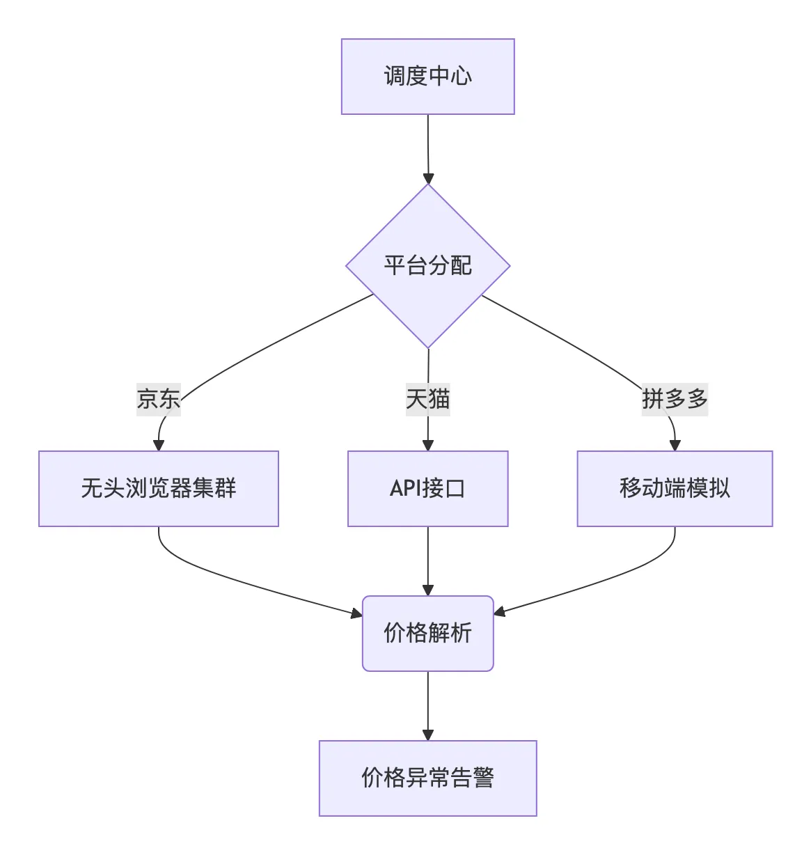 代码通过Promise.allSettled实现多平台价格监控任务的并行调度,将京东(JDCrawler)、天猫(TMCrawler)、拼多多(PDDCrawler)三大平台的请求任务分配到不同线程/进程执行。这种设计符合分布式架构中任务分片和负载均衡的核心思想,能有效应对高并发场景(如秒杀期间的价格监控),避免单点性能瓶颈。
