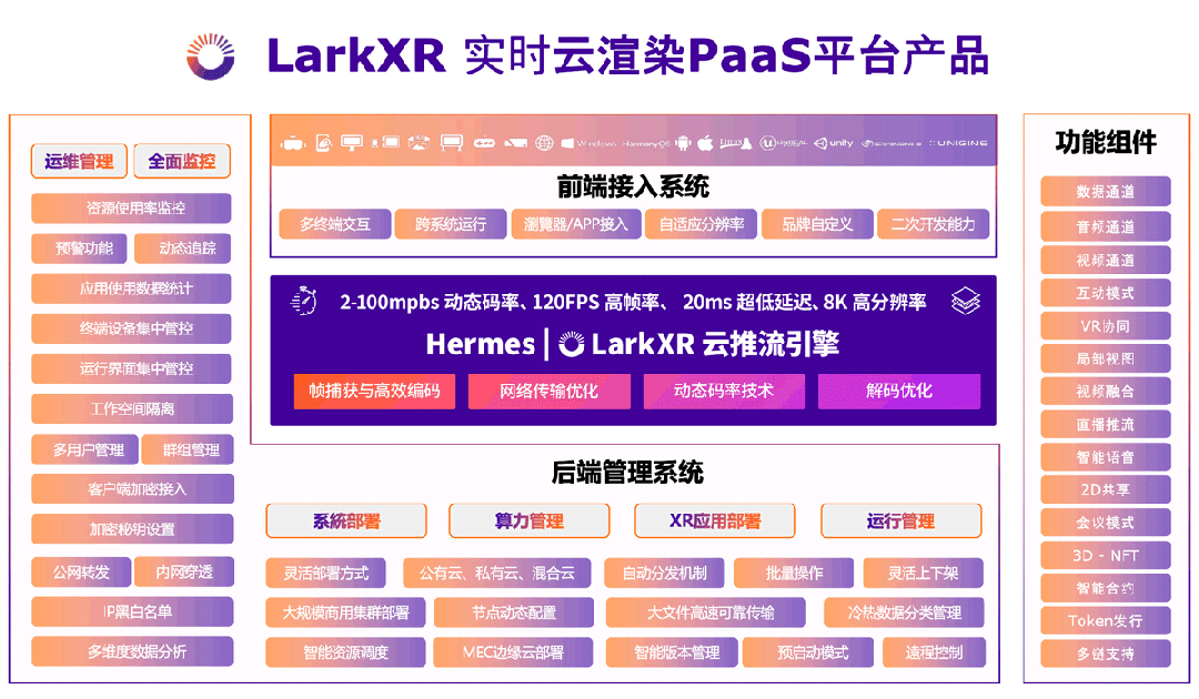 LarkXR作为一款开箱即用的实时云渲染PaaS平台产品,覆盖了从云端的算力与应用管理,网络层的流式传输优化,以及异构终端的接入全流程,提供更完整的企业级解决方案。像素流送仅相当于LarkXR中的Hermes流式传输模块。