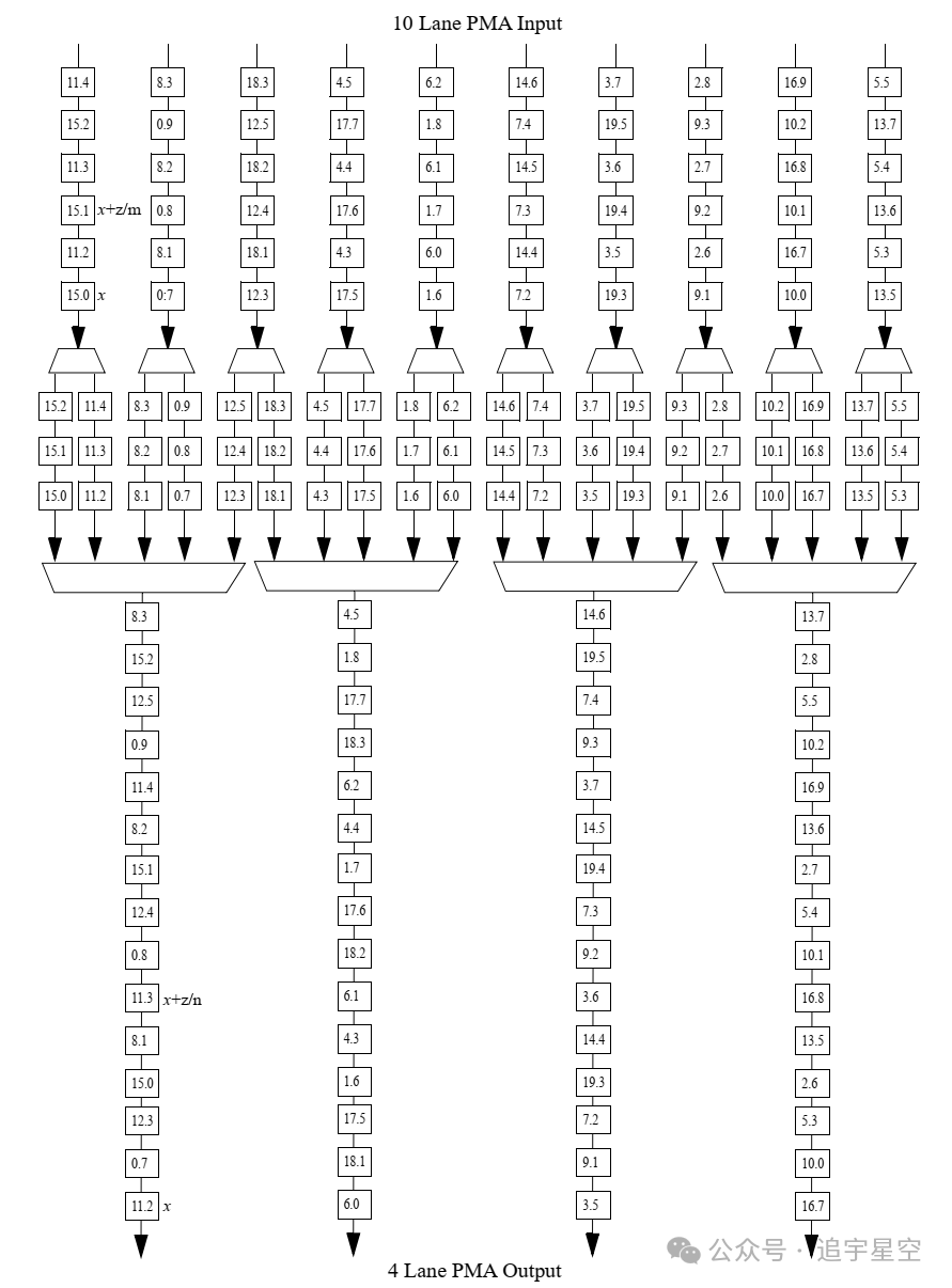 在输入通道上的任何时间位置接收到的每个PCSL都被转移到输出通道上的时间位置。由于PCS具有完全灵活的接收逻辑,因此实现可以自由地执行PCSL从输入通道到输出通道的映射,而不受约束。下图说明了10:4 PMA比特多路复用器的一种可能的比特排序。其他位顺序也是有效的。