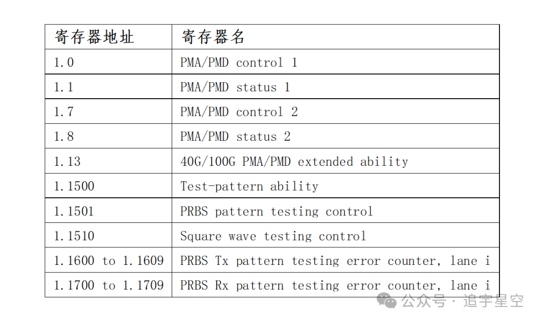 在每个发送方向上生成每个相应测试图案的能力由PRBS9 _Tx_generator _ability、PRBS9 _Rx_generator _ability、PRBS31 _Tx_ggenerator _ability和PRBS31 _Rx_ggenerator _ability状态变量表示,如果实施了C45 MDIO,则可以分别通过位1.1500.5、1.1500.4、1.1500.3和1.1500.1访问这些状态变量。