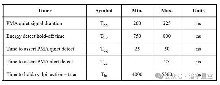 当支持可选的节能以太网(EEE)深度睡眠功能,并且PMA服务接口被物理实例化为XLAUI或CAUI-n时,需要本款中列出的附加功能。这些功能实现了对EEE深度睡眠功能运行至关重要的服务接口参数的通信。EEE操作的时序参数如下图所示。
