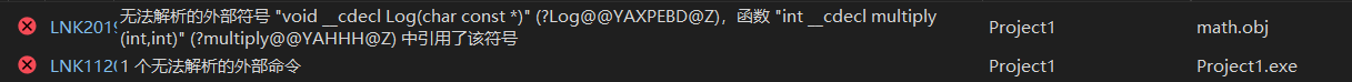 }如果将Log.cpp中的Log函数名换成其他的,那么build项目时会报错,这是由于Linking时需要找到Log函数,但是没有找到: