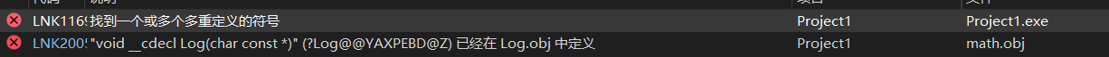 }运行时报错如下,这是因为实际上再两个cpp文件都进行了Log函数的定义,导致报错: