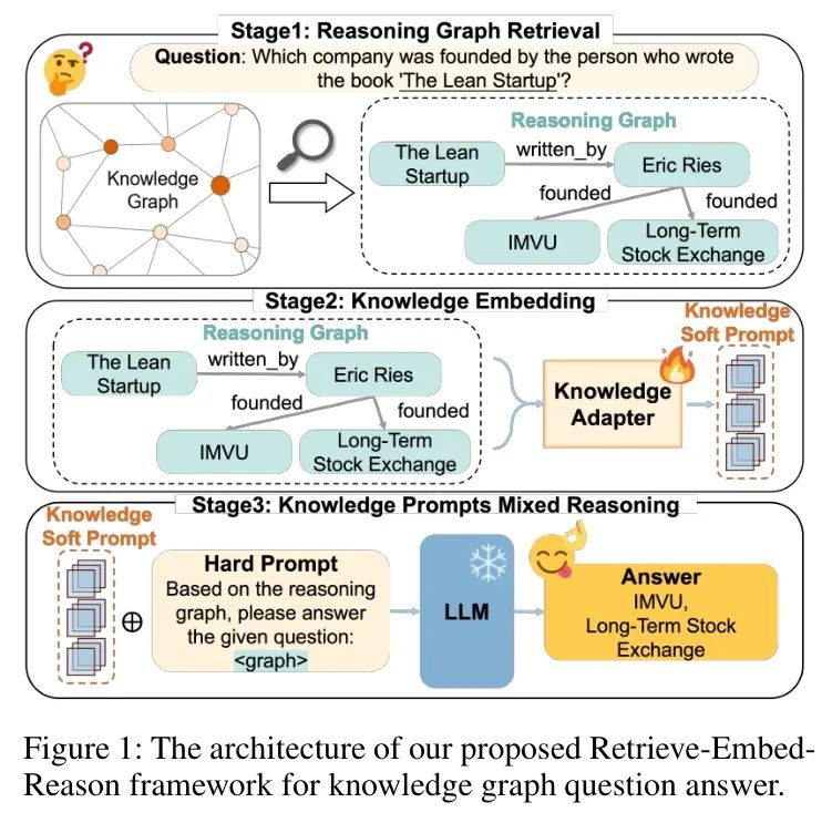 该框架围绕三个核心组件构建:检索模块、嵌入模块和推理模块。检索模块以关系作为基本检索单元,并根据问题的语义限制检索范围,以获取回答问题所需的推理图。这种方法不仅提高了检索的准确性和稳定性,还显著缩小了搜索空间,减少了频繁调用LLM的需求。接下来,嵌入模块引入了一个小型且精炼的基于Transformer的知识 Adapter ,从推理图中提取和整合文本和结构信息,生成非常适合LLM的表示。该模块提供了一种高效且简化的信息编码方式,解决了潜在的歧义和信息冗余问题,同时减少了所需的输入token数量和上下文窗口大小,从而实现更准确和高效的推理过程。最后,推理模块将嵌入的表示向量与精心设计的自然语言 Prompt 相结合,使LLM能够推导出最终答案。这种设计使LightPROF能够无缝支持任何开源LLM和各种知识图谱,在训练过程中仅需调整知识 Adapter ,而无需更新昂贵且耗时的LLM。作者的贡献总结如下: