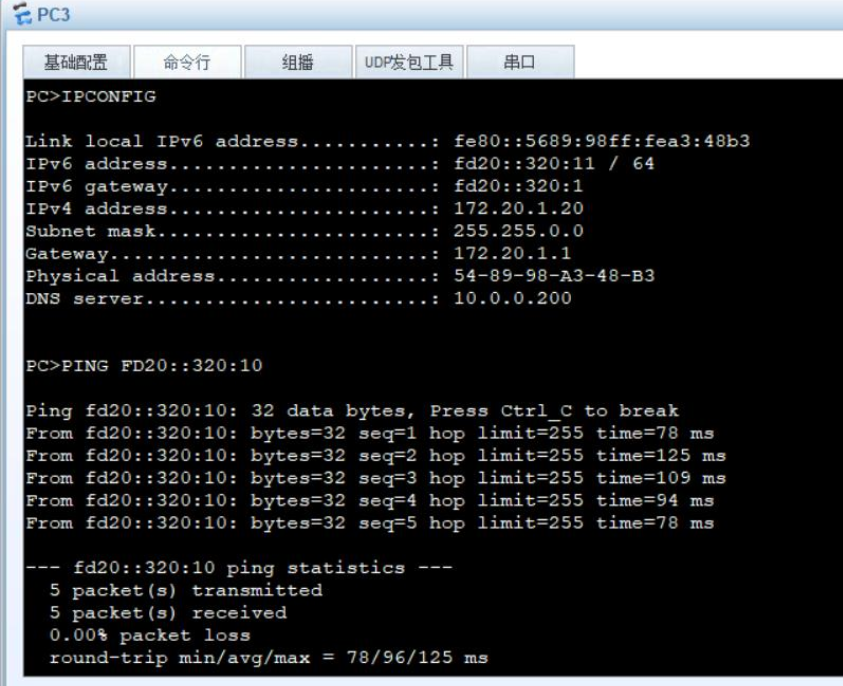 PC3 | E0/0/2 | 172.20.1.20/16FD20::320:11/64 | 172.20.1.1FD20::320:1 | VLAN20 |