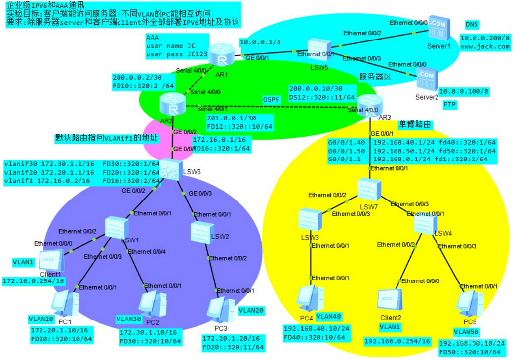 2.实验目标:客户端能访问服务器:不同VLAN的PC能相互访问