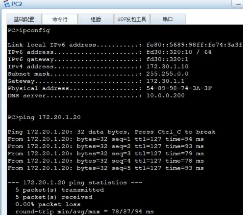 PC2 | E0/0/4 | 172.30.1.10/24FD30::320:10/64 | 172.30.1.1FD30::320:1 | VLAN30 |