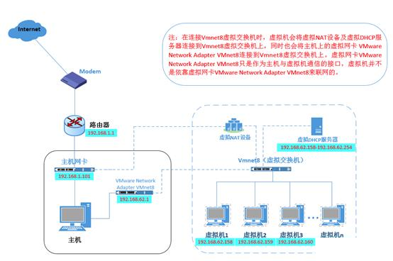 2) NAT模式:NAT(网络地址转,用于把内部的私有网络地址转换成可以通讯的公网地)NAT模式相当于在桥接的Vmnet0(虚拟交换机)上又加入了NAT设备和DHCP服务器来自行分配地址,也就是说,相当于在桥接模式的“交换机”上又加了个“路由器”,这样,物理主机和虚拟机的通讯就需要对于这个“路由器”进行配置才能实现和物理主机的通讯。示意图如下: