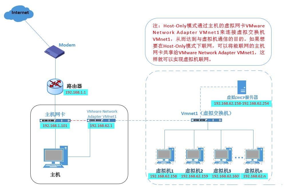 3) 本地模式:本地模式,是NAT模式去掉了NAT设备(只剩DHCP服务器)通过共享网卡可以实现上网。示意图如下: