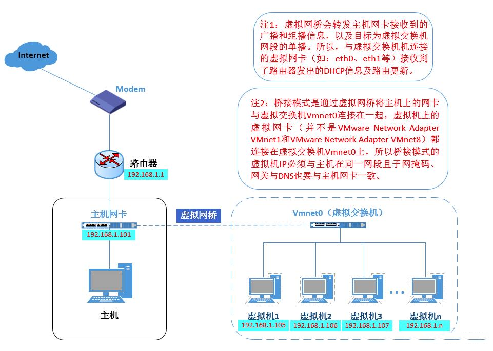 1) 桥接模式:在这种模式下,物理主机好像是一个“交换机”所有的虚拟机都连接这个物理主机的交换机上,所有虚拟机之间的交流不受影响,外界带有DHCP功能的路由器会直接分配给虚拟机地址,需要注意的是,你虚拟机的网段和物理机应在同一个网段,不然无法访问。示意图如下: