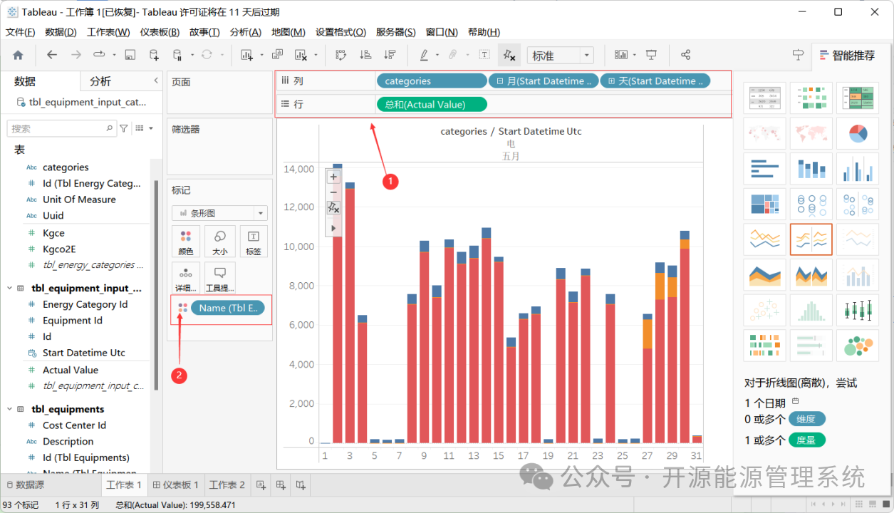 1、将“时间尺度-天”作为y轴,“时间尺度-月”、“能耗分项”作为x轴。