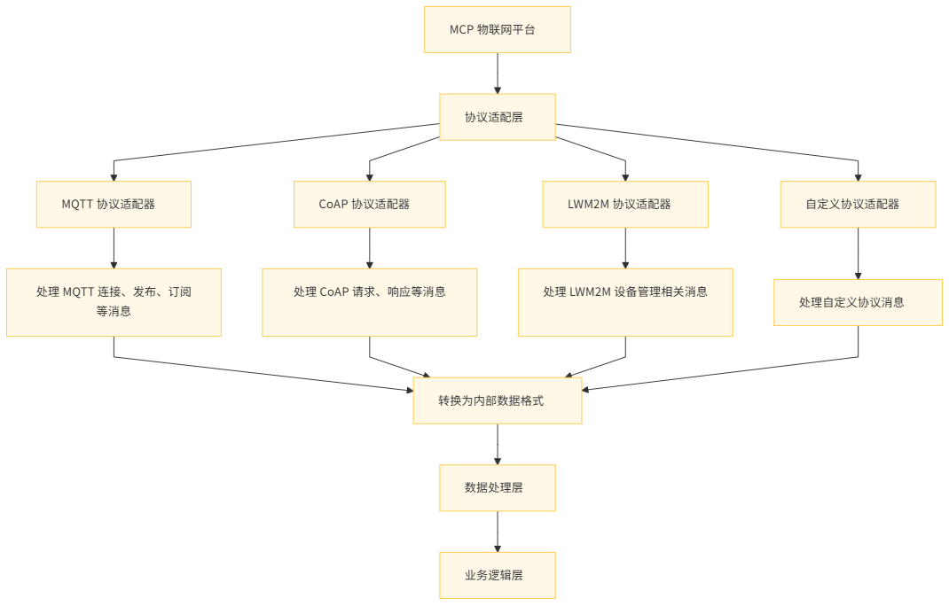 为了实现对多种物联网协议的支持和统一管理,MCP 物联网平台采用协议适配层。协议适配层负责将不同协议的消息转换为平台内部统一的数据格式,以便后续的数据处理和业务逻辑处理。